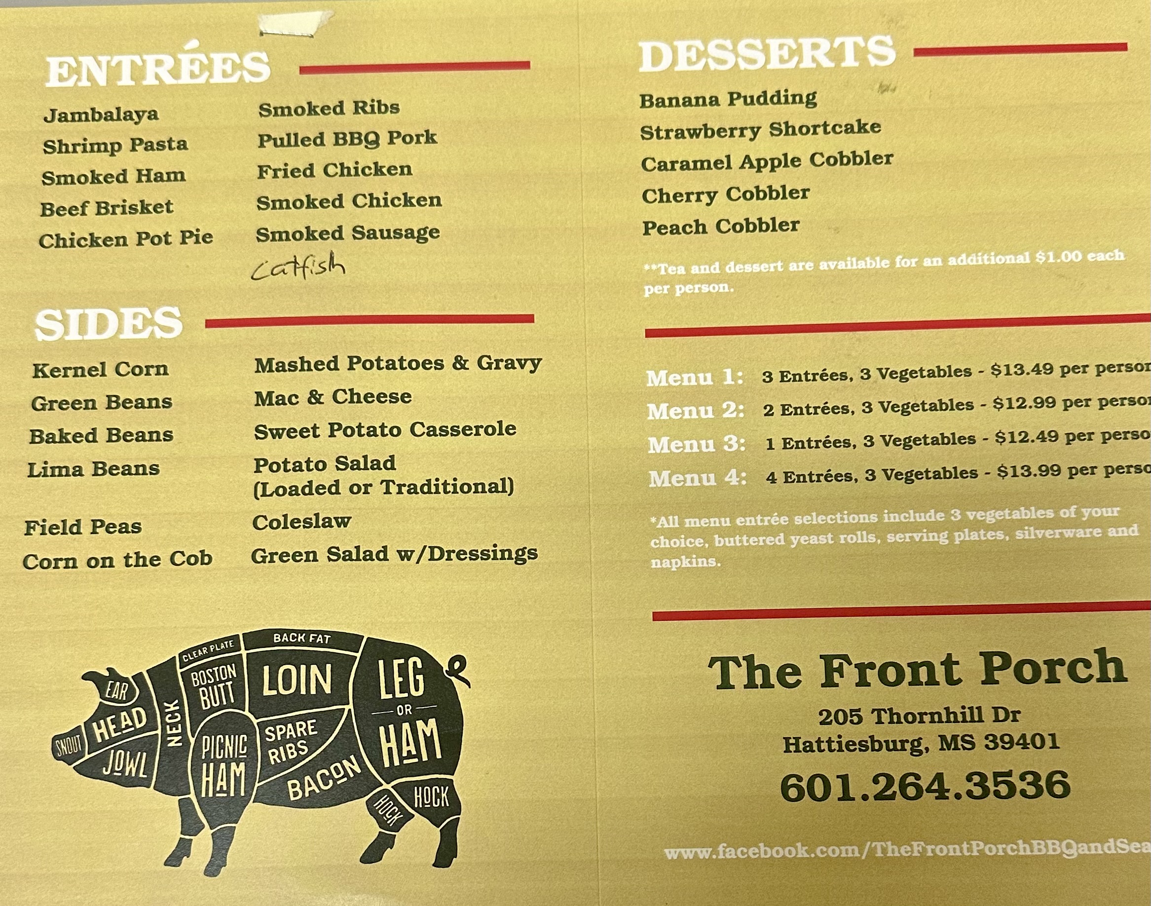 Welcome to The Front Porch BBQ & Seafood, a delectable buffet restaurant in Hattiesburg, MS, serving the greater surrounding area. Established with a passion for exceptional dining experiences, we offer a diverse buffet featuring mouthwatering options like BBQ specialties and fresh seafood. Our salad bar is always stocked with the freshest ingredients, catering to health-conscious diners. Whether you choose to dine-in or enjoy our takeout options, our flavorful dishes are sure to impress. We also provide buffet catering services for special events, bringing our delicious offerings to your gatherings. Taste the goodness and hospitality of The Front Porch BBQ & Seafood – where every bite feels like a warm welcome.